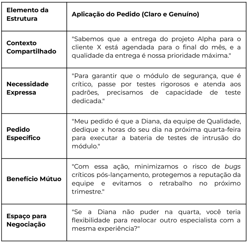 Com base nos ensinamentos de Marshall Rosenberg e nos achados de Heidi Grant, proponho uma estrutura como inspiração para fomentar o desenvolvimento da habilidade de pedir. Um framework simples, mas que tem apresentado bons resultados nas organizações que se utilizam da sugestão.